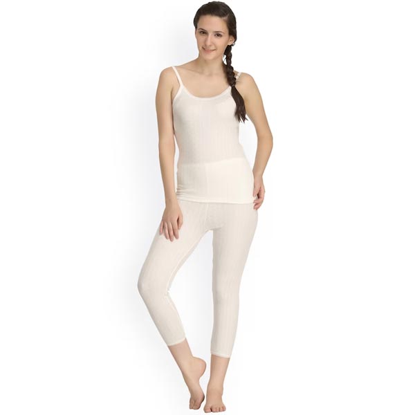 Off-white mid-rise thermal three-fourth leggings in a patterned weave, has an elasticated waistband